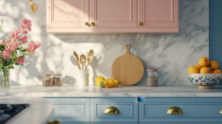 A beautiful and inviting kitchen featuring pastel cabinets with fresh fruits and flowers. The stylish decor and natural light create a cheerful atmosphere perfect for culinary creativity.