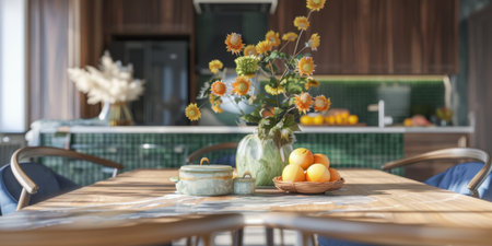 Vibrant flower bouquet in cozy kitchen with fresh vegetables. That the image is generated using AI.