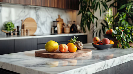 Modern kitchen with marble countertop and fresh produce, encouraging healthy living