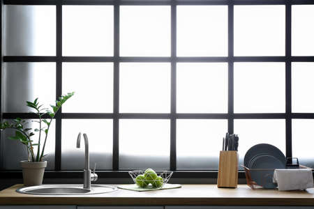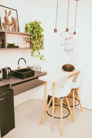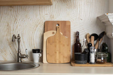 Kitchen work surface, the interior elements, Scandinavian rustic eco design with green plant
