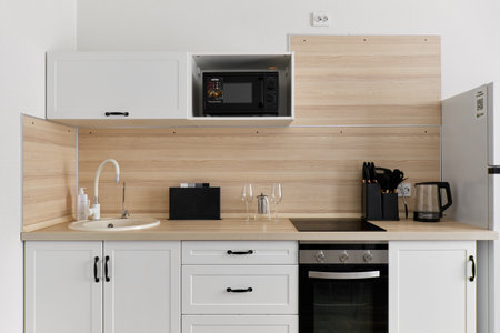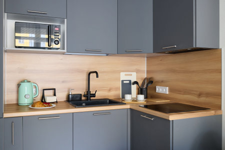 Cropped view of modern Nordic kitchen interior design with induction cooker. kitchenware and decor. House after renovation. Spacious apartments