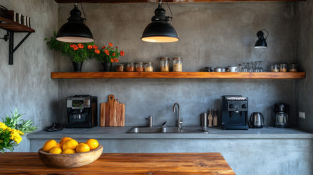 Black loft kitchen lamps in a modern style with gray cabinets, white lockers and shelves with accessories. There is a stone table top