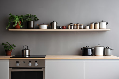 Modern kitchen with shelves, food, spice and dishes.kitchen corner with various cooking utensils including plants,wooden utensils ,glass container.loft interior of kitchen in apartment.