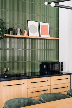 This modern kitchen showcases a sleek design with green tiled walls and wooden cabinets. Functional household appliances are paired with stylish decor, creating a cozy atmosphere for cooking.