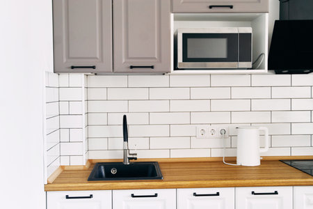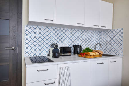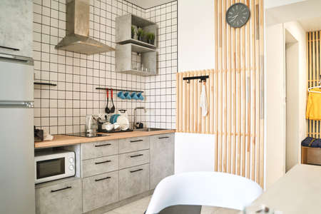 Beautiful modern interior design in the kitchen in the Scandinavian style. White grey kitchen room organization