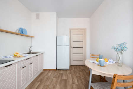 Modern kitchen landscape. Home interior. Light counter. No people. Lifestyle design. Fridge and cooking panel