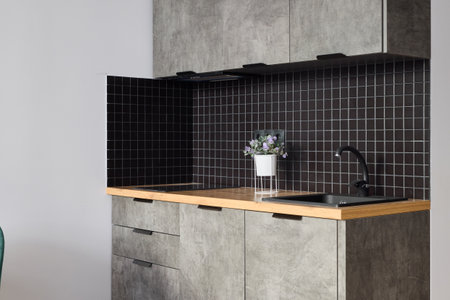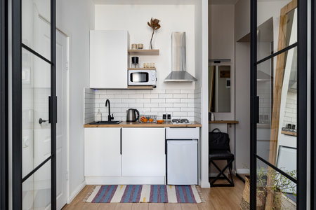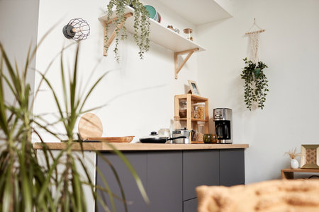 Background image of simple kitchen area interior in studio apartment decorated with green plants , copy space