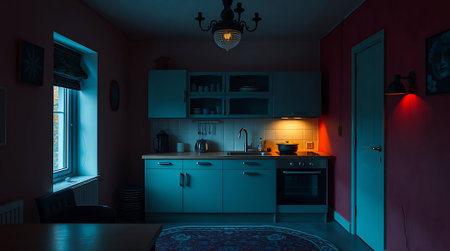 Moody, vintage-inspired kitchen featuring modern appliances. Perfect for home decor and lifestyle content that adds elegance and intrigue to your designs now.