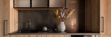 Panorama of small kitchen with wooden furniture and stylish decorations