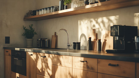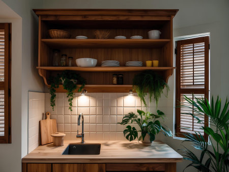 Stylish rustic kitchen interior with jars of ingredients, coffee machine, plants, and a tiled backsplash. The wooden countertop and neatly organized shelves create a cozy and inviting atmosphere.