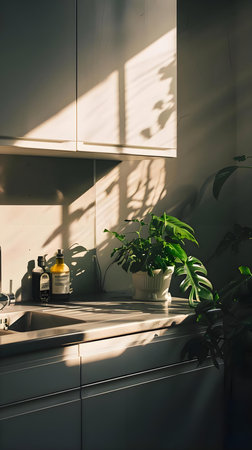 Soft sunlight streams through a window, illuminating a charming kitchen filled with plants and kitchenware.
