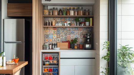 Compact kitchen design with smart storage solutions, a pull-out pantry, and a tiled backsplash adding a splash of color.
