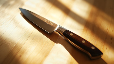 A sharp kitchen knife lies on a wooden cutting board ready for meal preparation in a warm kitchen.