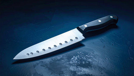 A sharp kitchen knife resting on a marble countertop in a dimly lit kitchen during the evening
