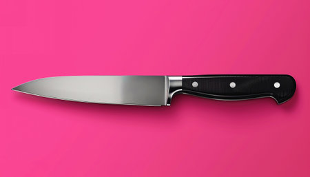 A chef's knife with a sleek blade and black handle lies against a striking pink background, offering a pop of color and a touch of culinary professionalism.