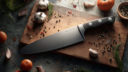 stainless steel kitchen knife on a wooden cutting board. food preparation with professional utensils. dark background. copy space advertisement concept