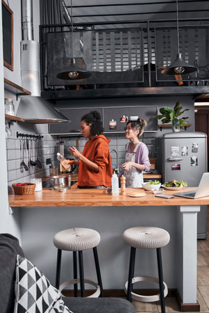 Girls having fun while cooking together at kitchen