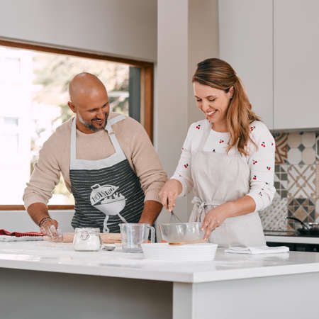 Happy diverse couple baking together in kitchen, using tablet at home. Lifestyle, togetherness, relationship, baking, recipe, communication and domestic life, unaltered.