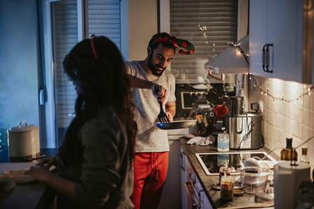 Happy couple preparing Christmas dinner in the kitchen