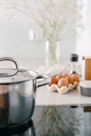 selective focus on cooking pot with lid on glass ceramic cooker at modern light kitchen, eggs on countertop and blurred background
