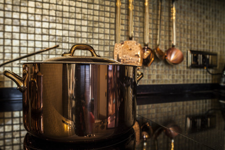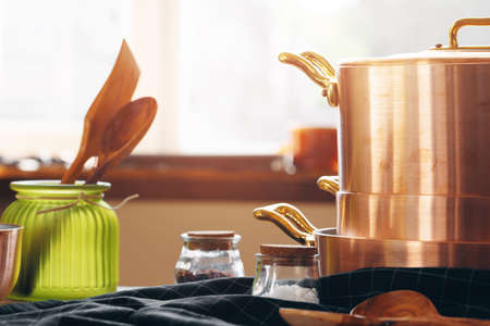Close up of modern kitchen interior with copper cookware