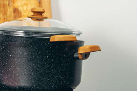 Cooking pot on the kitchen table in a modern style. Selective focus.