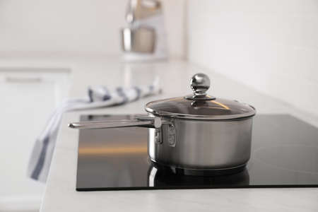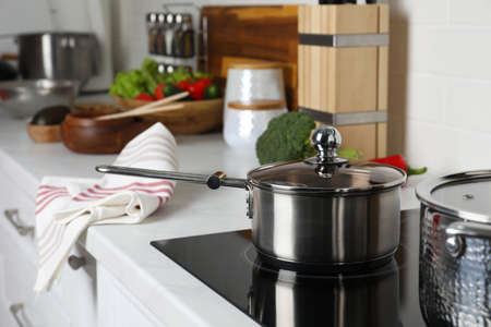 New clean saucepan on cooktop in kitchen