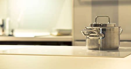A metal pot on an electric induction cooker in a modern kitchen. Copy space.