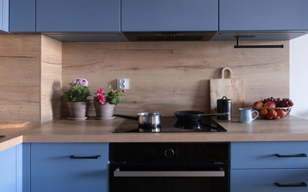 modern wooden kitchen in blue tones with flowers and fruits