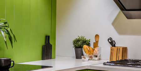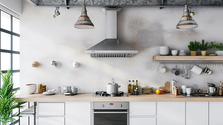 A Close View on the Clean and Bright Kitchen Room with White Wall. Generative AI