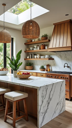 Discover a stunning modern kitchen adorned with natural textures and minimalist design. Featuring rattan ceiling lights, warm wood accents, and fresh flowers, this inviting space is perfect for culinary creativity and home gatherings.