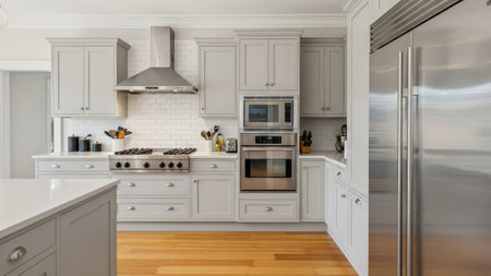 White kitchen with stainless steel appliances. Nobody inside. Northwest, USA