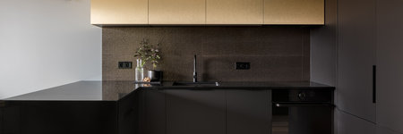Panorama of elegant kitchen interior with golden upper cupboards and black drawers, countertop, sink, tap and furniture