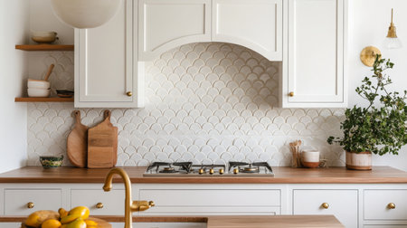 A modern kitchen with white cabinets and a beautiful scale-shaped tile backsplash