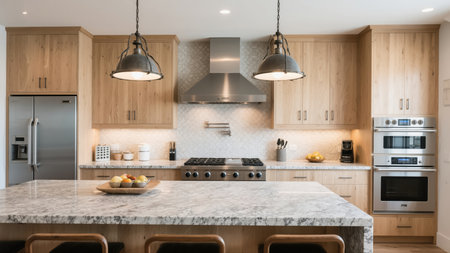 A bright and modern kitchen features stainless steel appliances, sleek wooden cabinets, and a striking white marble island. Fruit bowl sits on the island. The kitchen is well-lit by stylish hanging lamps, creating a warm and inviting atmosphere. It combines functionality with sophisticated design, making it a perfect culinary space. AI generated.