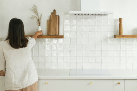 Stylish woman unpacking and decorating shelves with utensils in new minimal white kitchen. Housewife cleaning up kitchen after moving in new modern scandinavian home