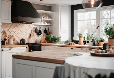 Beautiful modern kitchen interior design in scandinavian style. AI generated.