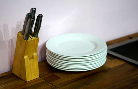 Close-up view of Knives stand,plates and kitchen sink, interior decoration concept