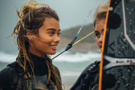 Multiethnic female athletes sporting wetsuits gearing up for kite surfing
