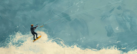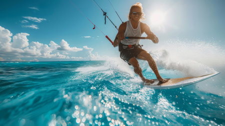 A kite surfer skillfully navigates the ocean waves, showcasing agility and balance. The sun shines brightly, highlighting the water splashes and creating a dynamic scene.