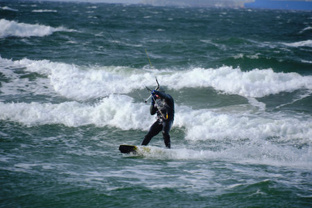 Kitesurfing, riding board waves during storm holding to flying kite