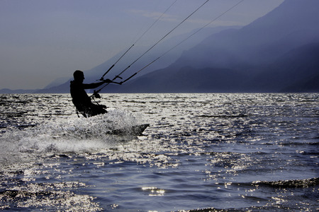 kitesurfing, silhouette of sportmen on blue