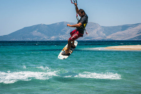 man kitesurfer athlete jumping while performing kite-surfing jump kite-boarding school kite spot