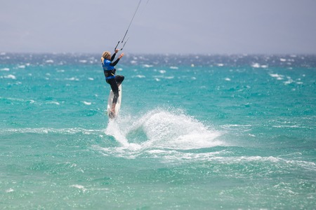 CORRALEJO, SPAIN - APRIL 28 Kitesurfer enjoys perfect wind and waves combination on 28 April 2012 in Corralejo, Fuerteventura, Spain