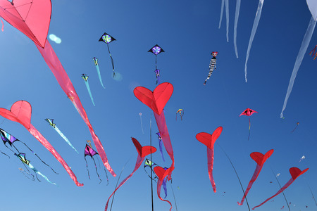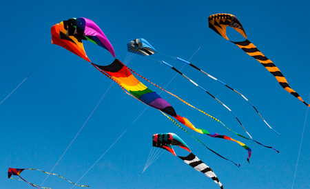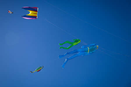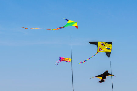 Colorful kites flying in the wind. Blue sky background. Bright shaped kites in the air. Various kites flying on the blue sky in the kite festival.