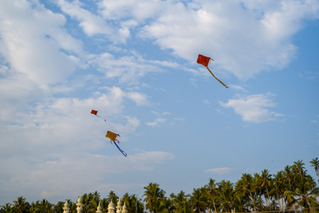 Kovalam, India - March 1, 2023: Three colorful kites with tails are seen flying in the blue sky with scattered clouds above palm trees at Grove Beach.