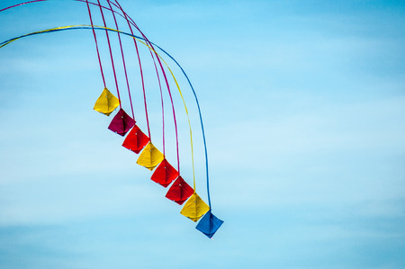 Traditional kite with colorful tail free on cloudy blue sky background, sunny day. Kids and adults leisure activity, freedom happiness concept.