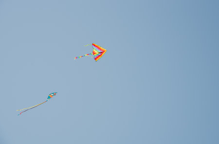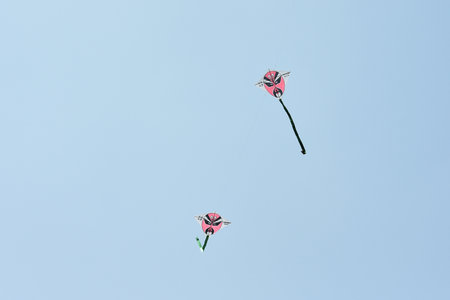 Vibrant kites soar joyfully against a serene blue sky, their tails fluttering with delight. This cheerful scene captures the fun and freedom of playful outdoor activities.