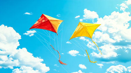 Red and Yellow Kites Flying in Blue Sky with White Clouds – Summer Festival Concept