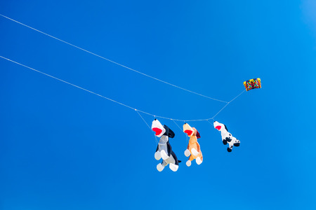 festival of kites, kites in the sky on a sunny day. Various kites flying on the blue sky